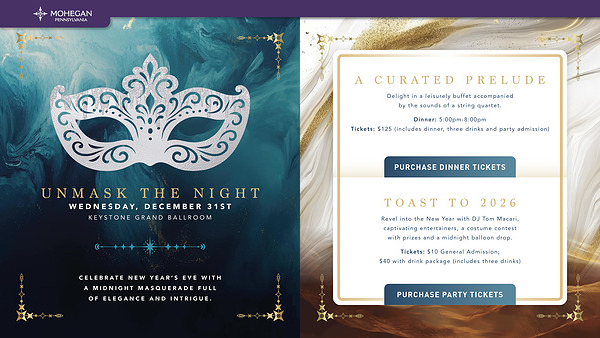 Revel into the New Year with DJ Tom Macari, captivating entertainers, a costume contest with prizes and a midnight balloon drop.